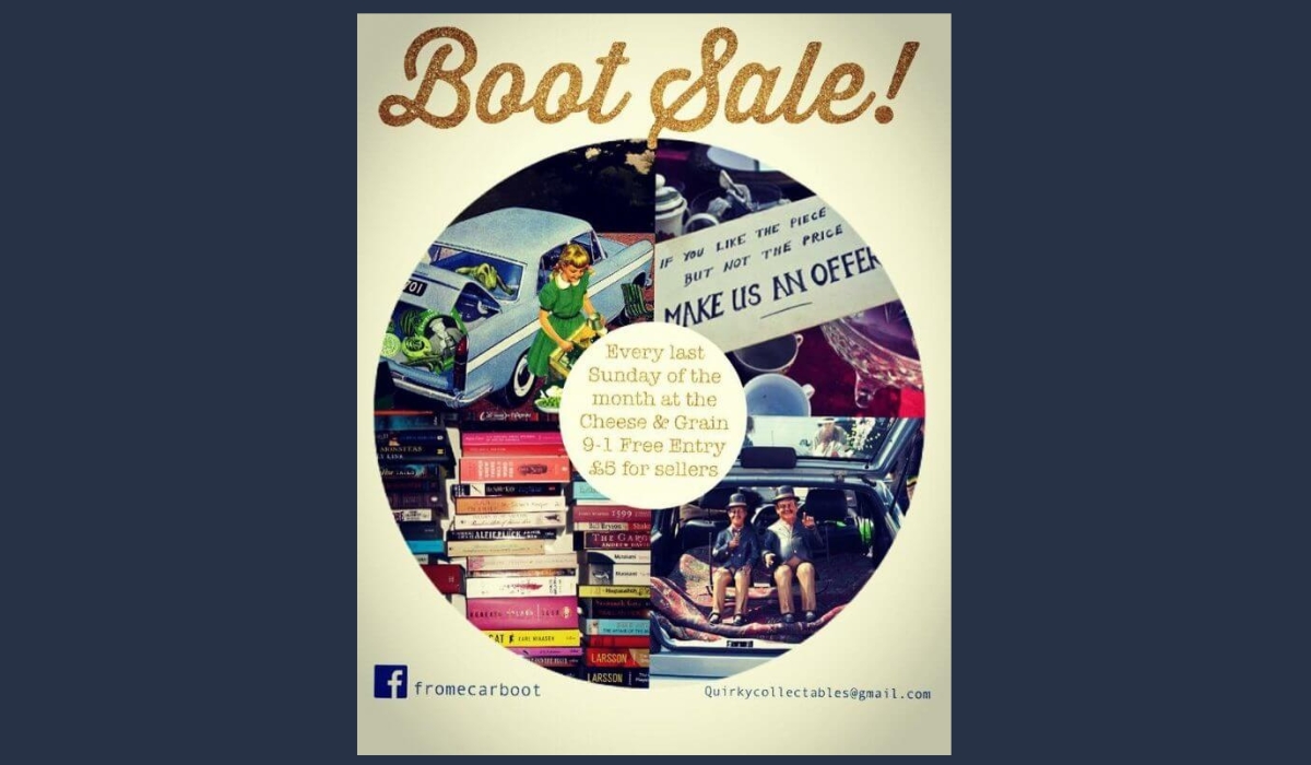 May 24 09:00 - 13:00 Frome Car Boot Cheese and Grain Car Park Market Yard, Frome Event Details Get Directions